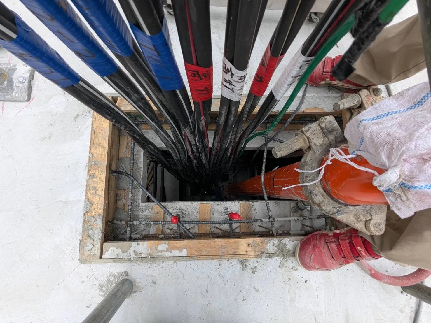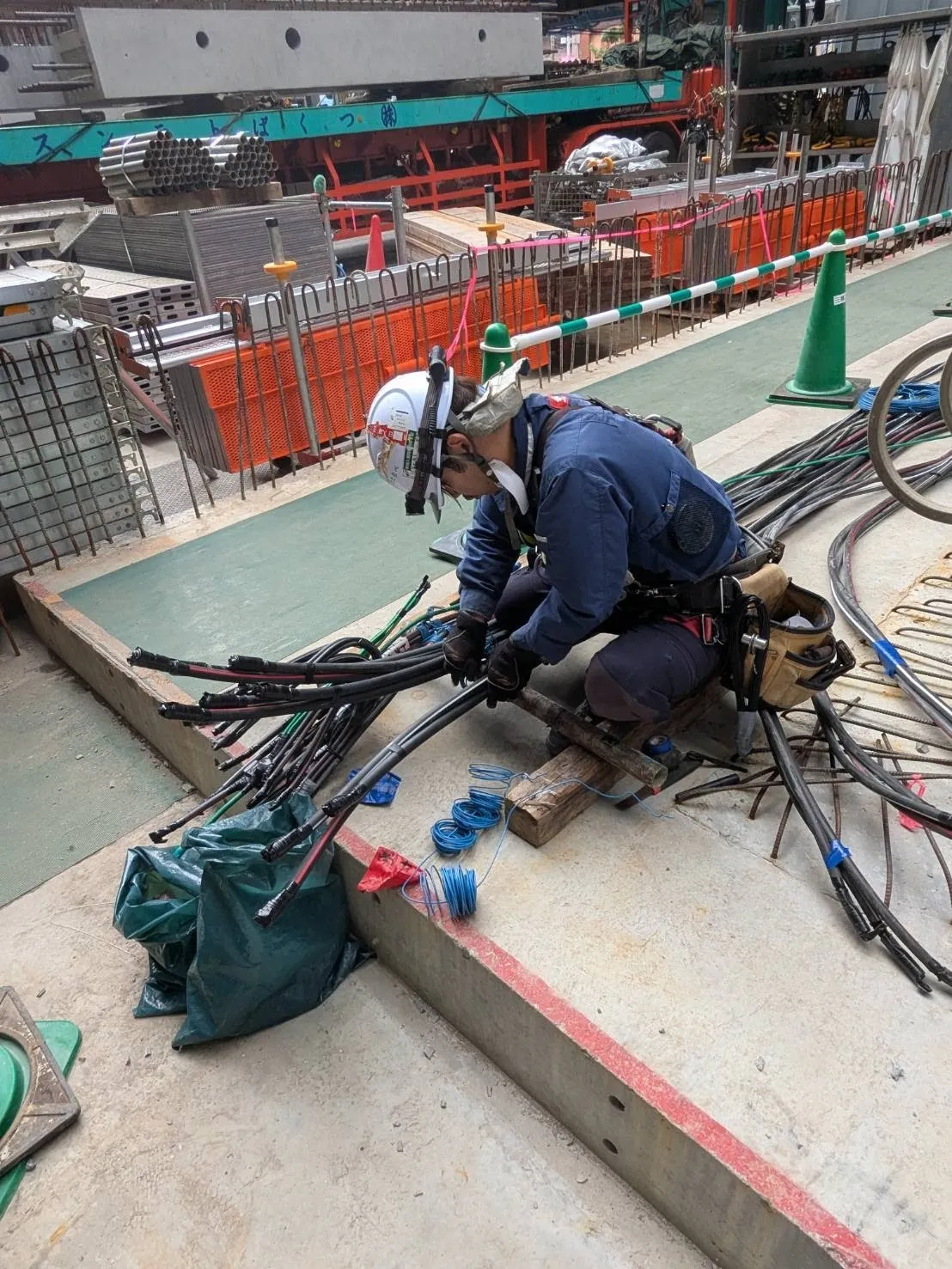 幹線投入 2025/09/11 都内某所での新築高層マンションでのタワークレーンによる立ち上がり幹線投入作業状況です。写真の通り、1Fで幹線加工揚重段取り作業を経てのホームぺージ動画を見ての通りで鳶さんと連携取りながら、9F〜6Fまで幹線を開口部からの投入になります。緊張感漂う中、無事に終えることができました。当社社員の技術力で無事に上棟まで事故なく進めてもらうことを祈ります。